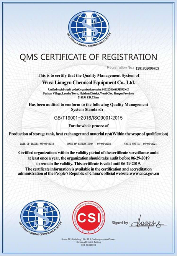 我們?nèi)〉脡毫θ萜髦圃煸S可證單位,具備A2級(jí)(I、II、III)碳鋼、不銹鋼壓力容器制造資質(zhì),并通過(guò)ISO9001質(zhì)量體系認(rèn)證。